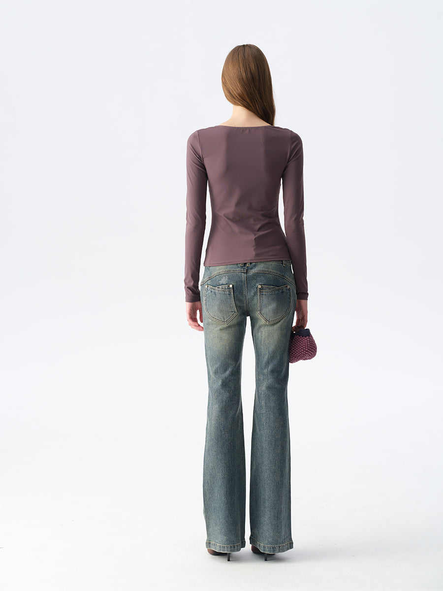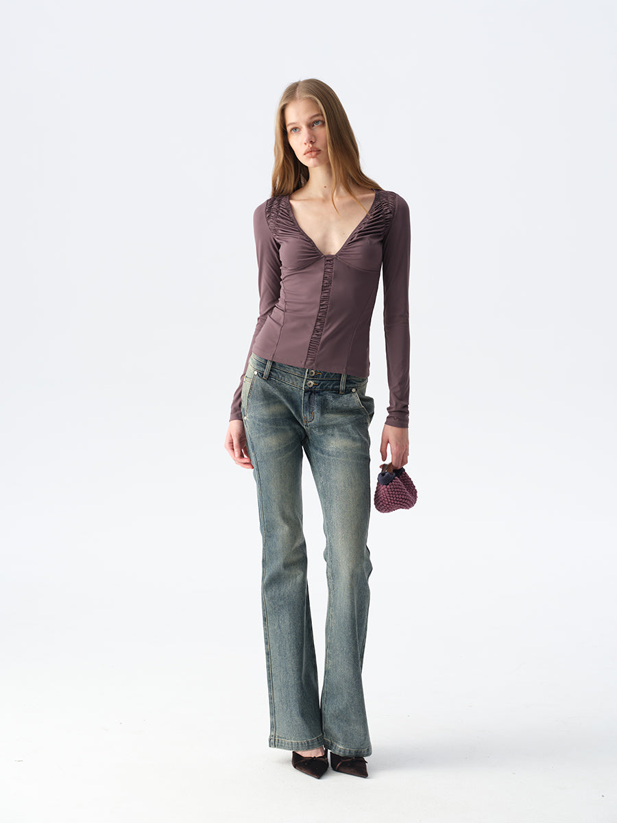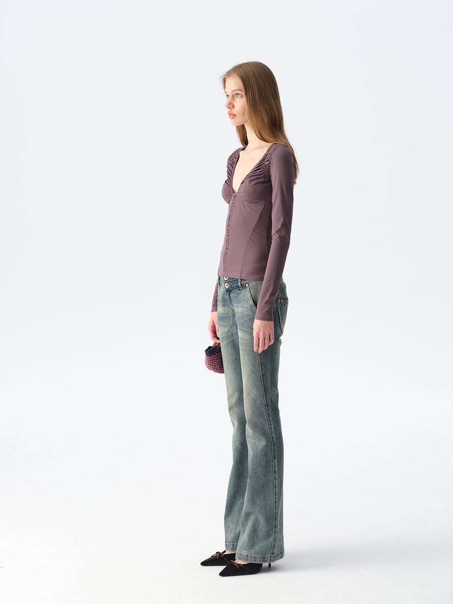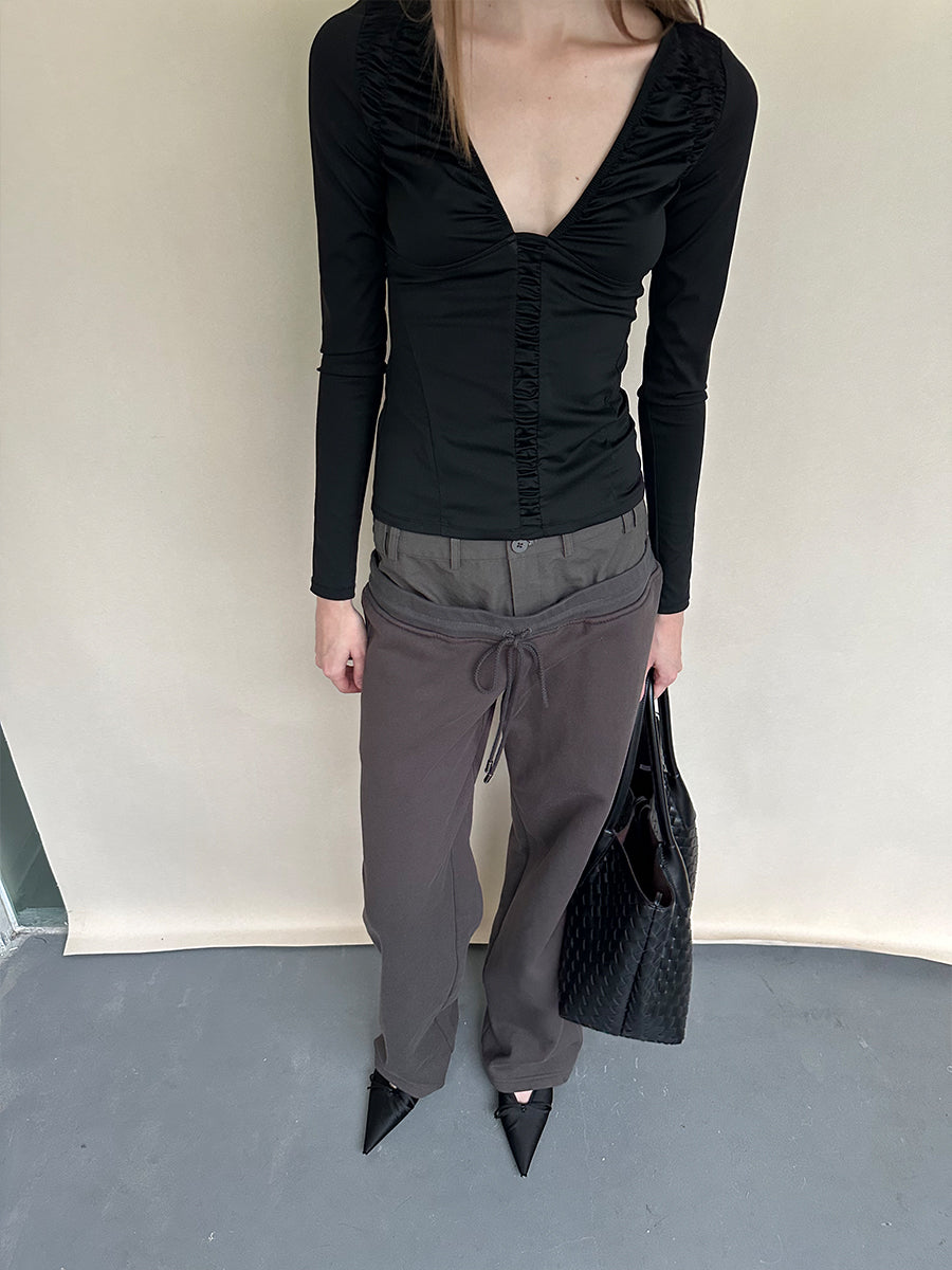 Dotyears Ruffled Plunging Neckline Top in Black & Purple