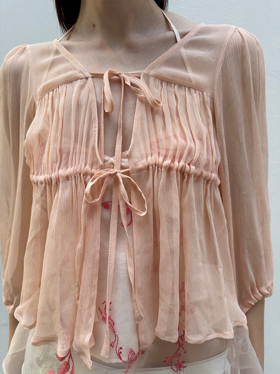Dotyears silk tulle over a pale pink strappy cardigan