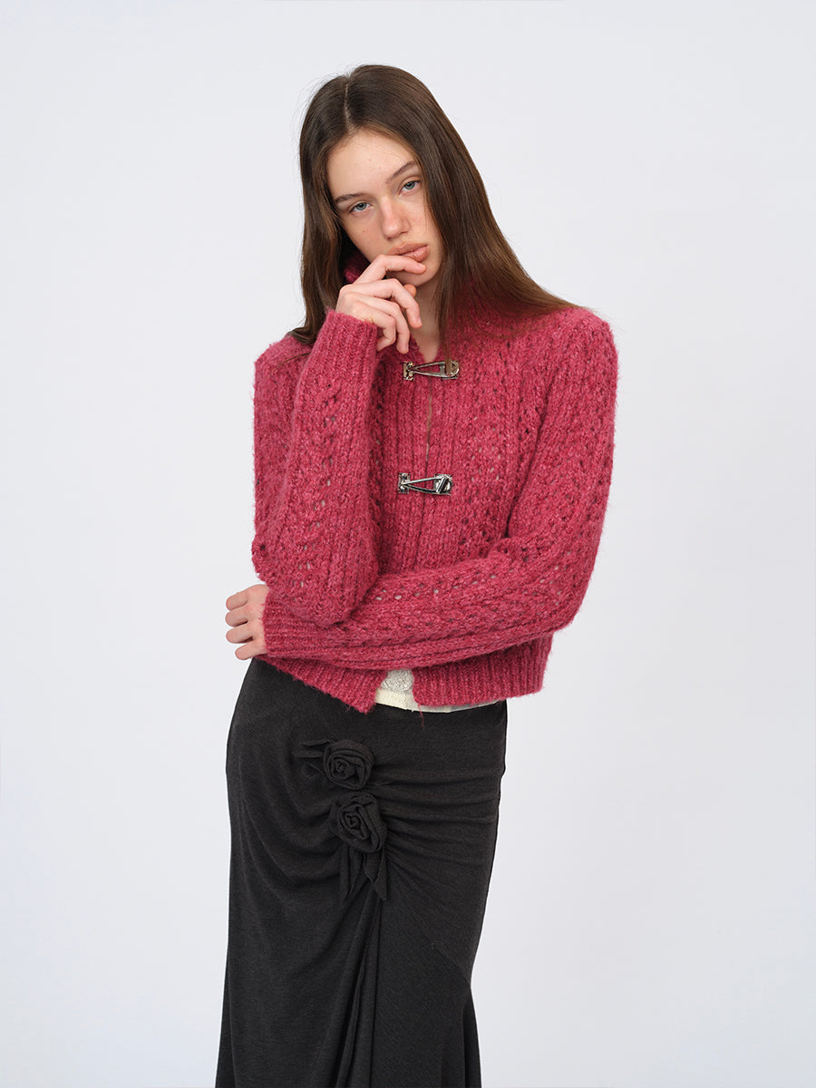 Dotyears Two-Tone Openwork Chunky Knit Cardigan with Wooden Buttons