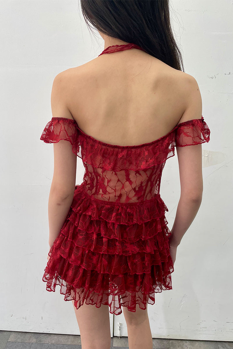Dotyears24ss One-shouldered, two-tone black and red lace lace cardigan, midi top with lace tie