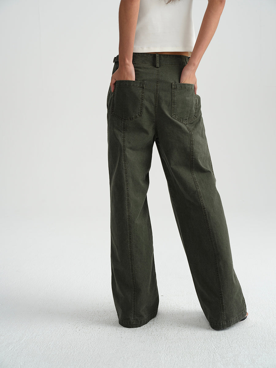 Hughum Army green cotton washed cargo casual low-rise straight trousers