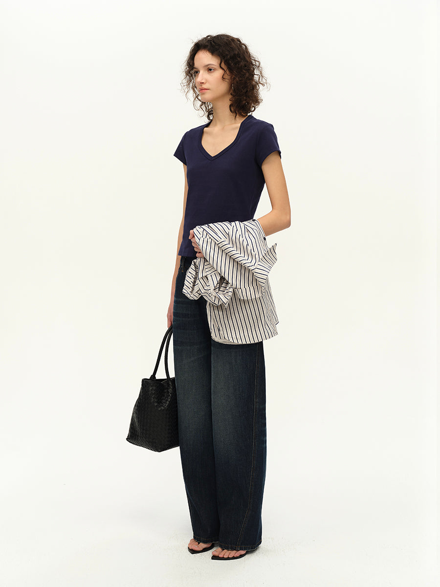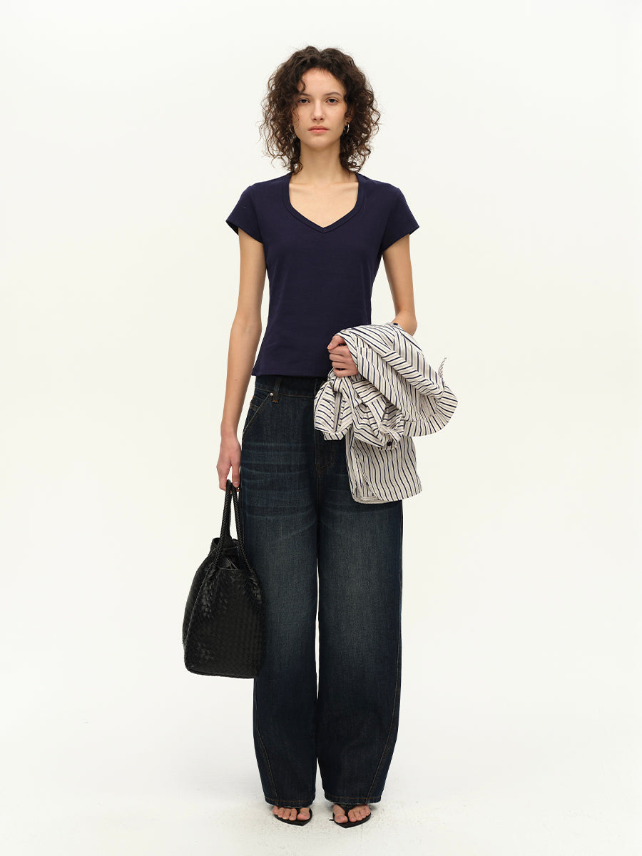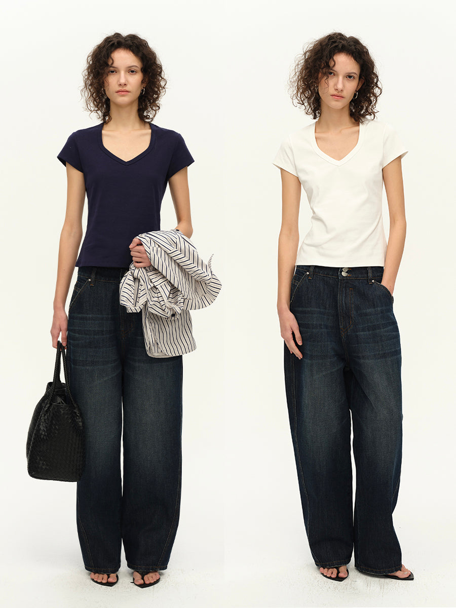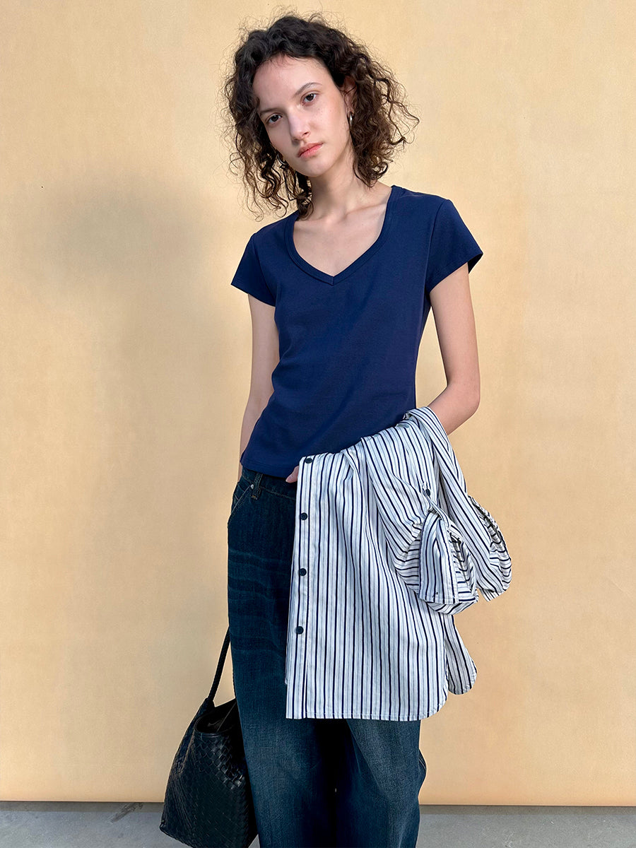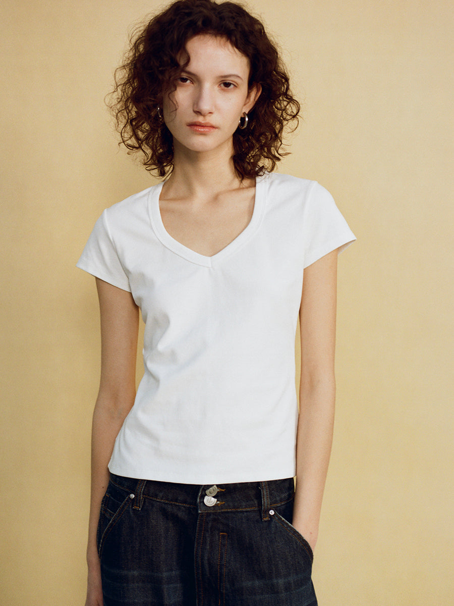 Hughum Curved V-neck Khmer knitted short T-shirt