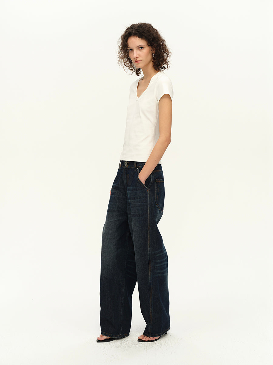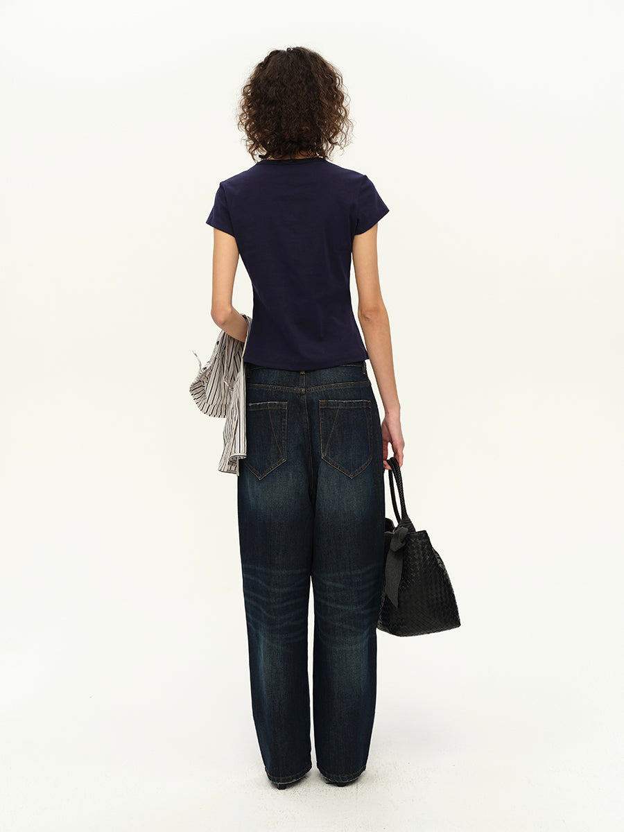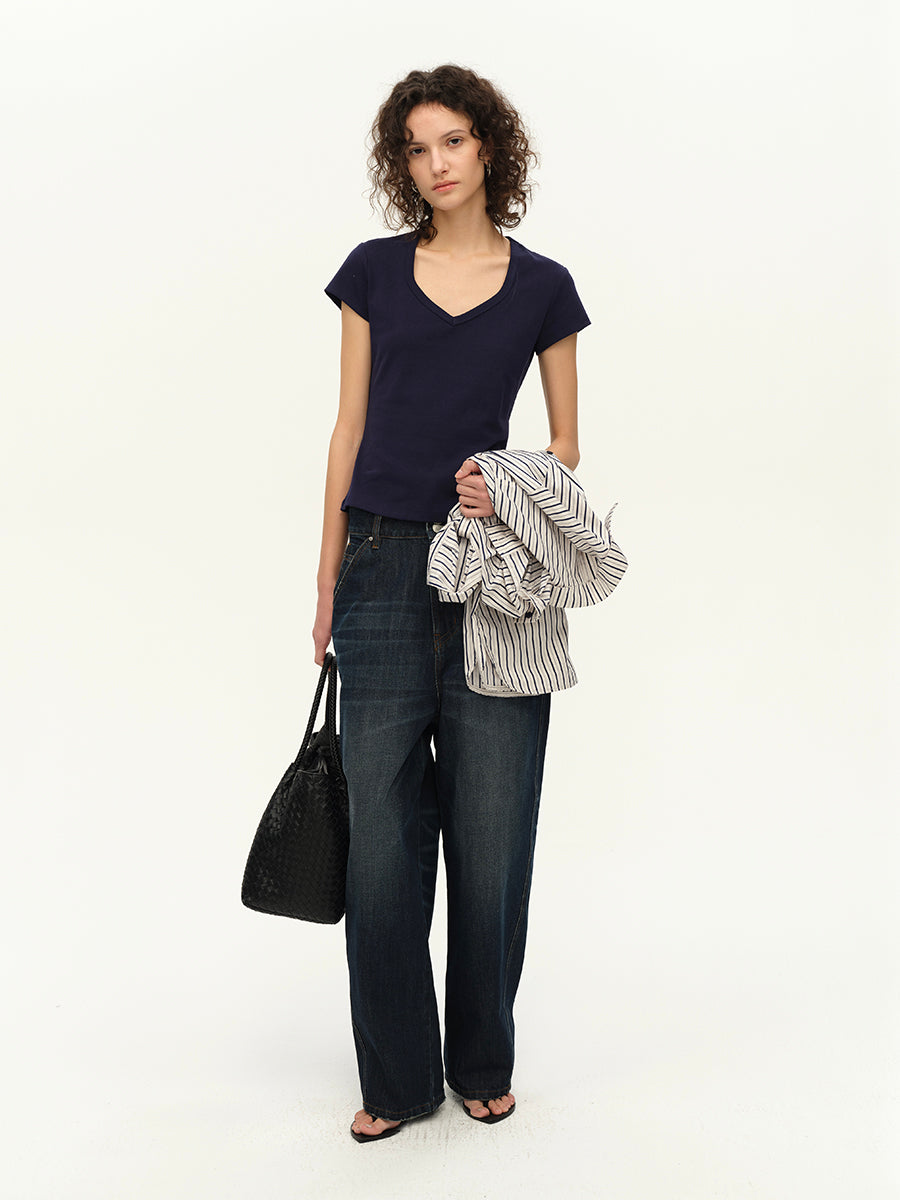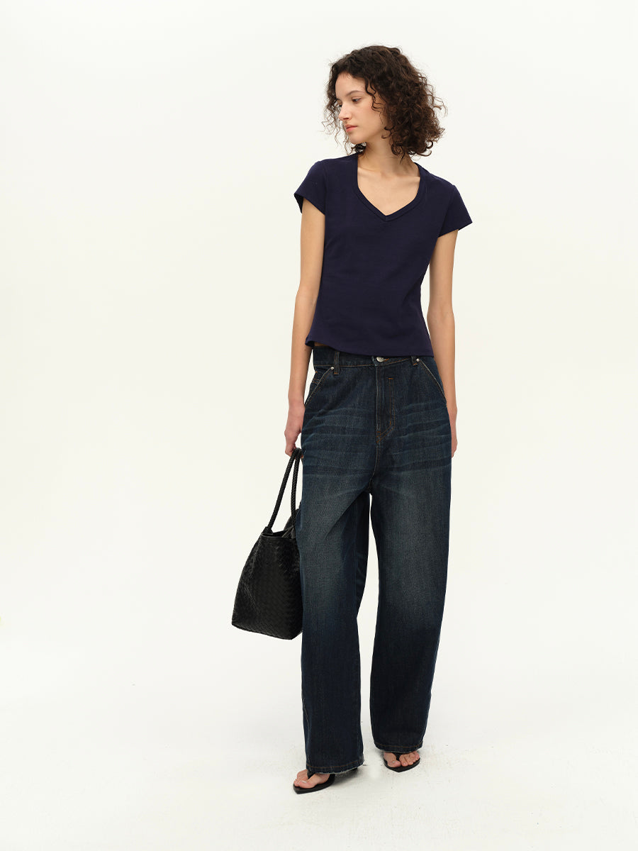Hughum Curved V-neck Khmer knitted short T-shirt