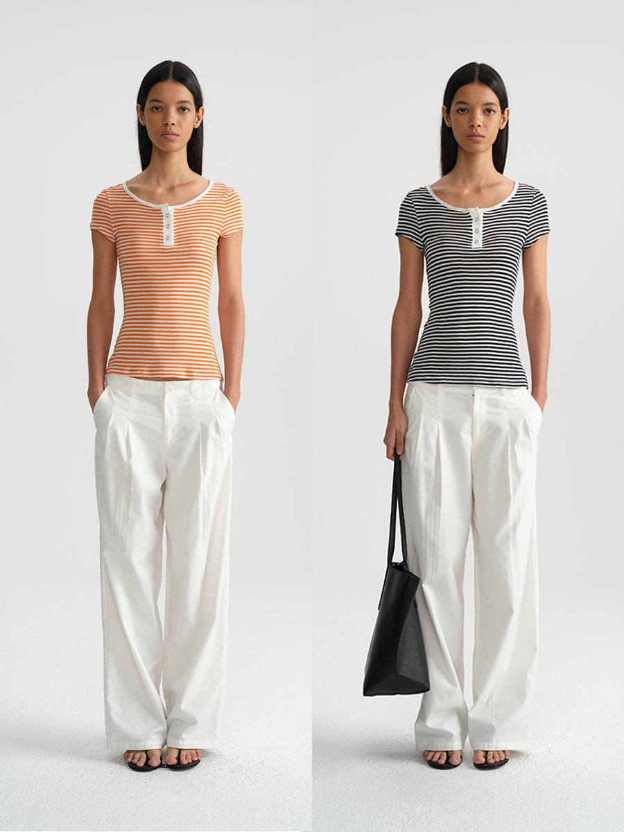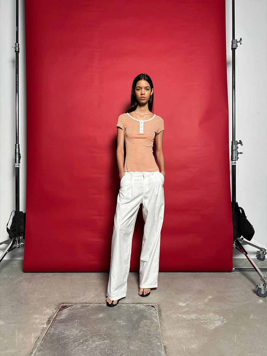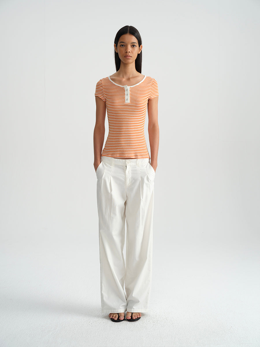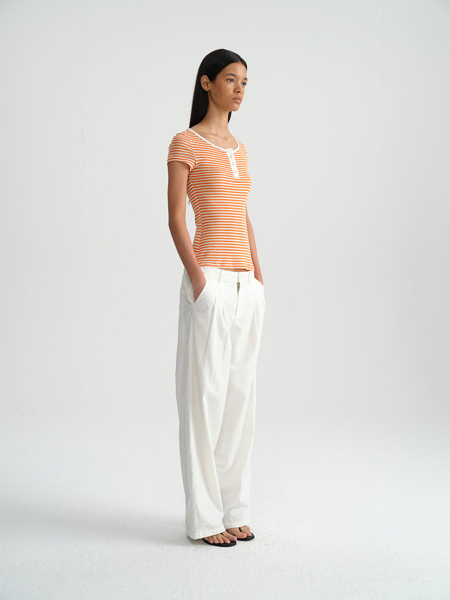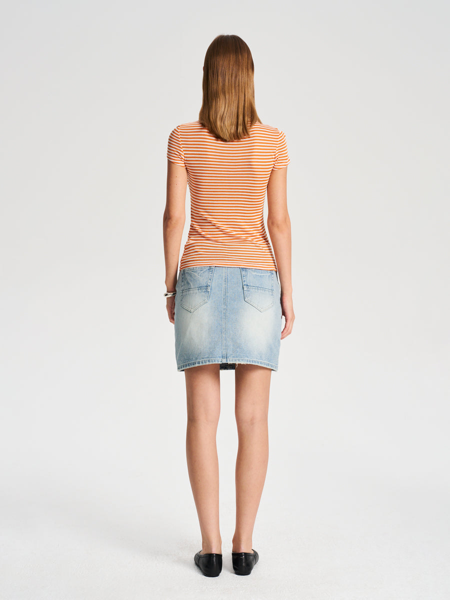 Hughum Orange navy blue sky silk knit crewneck waist T-shirt