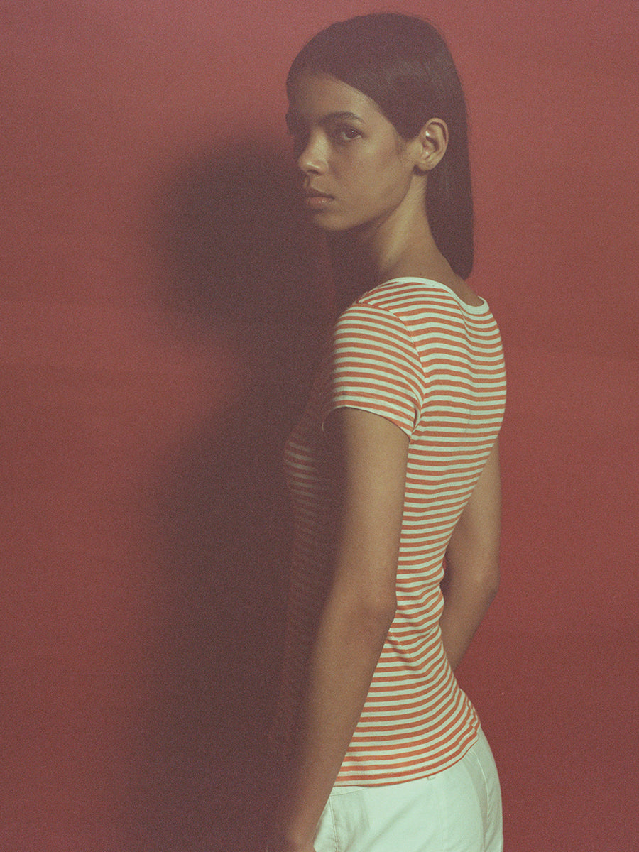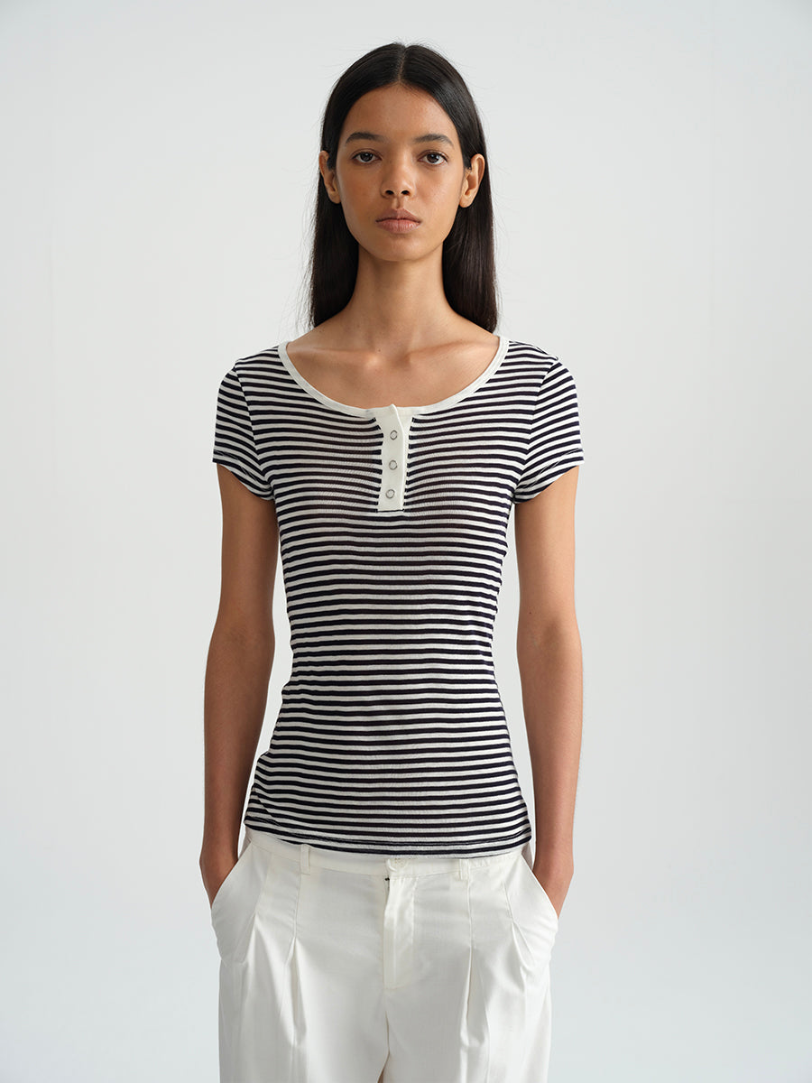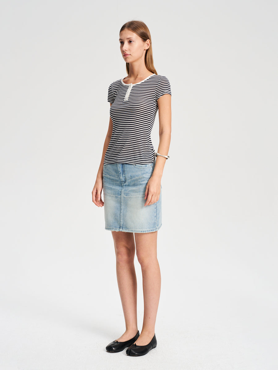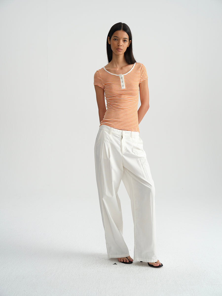Hughum Orange navy blue sky silk knit crewneck waist T-shirt