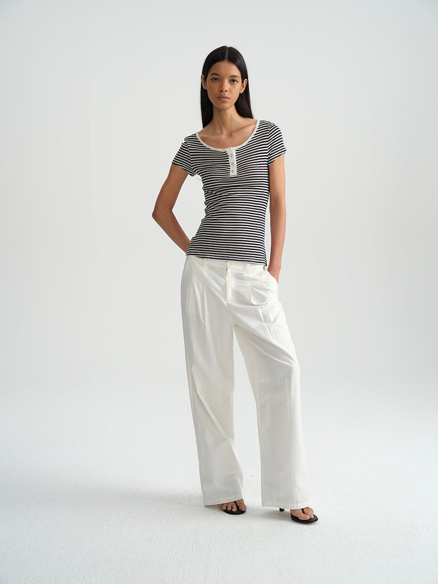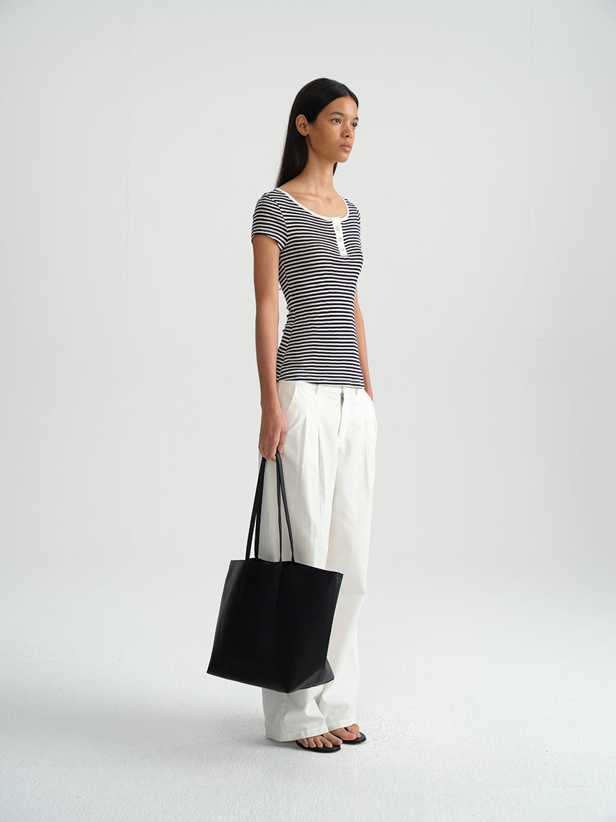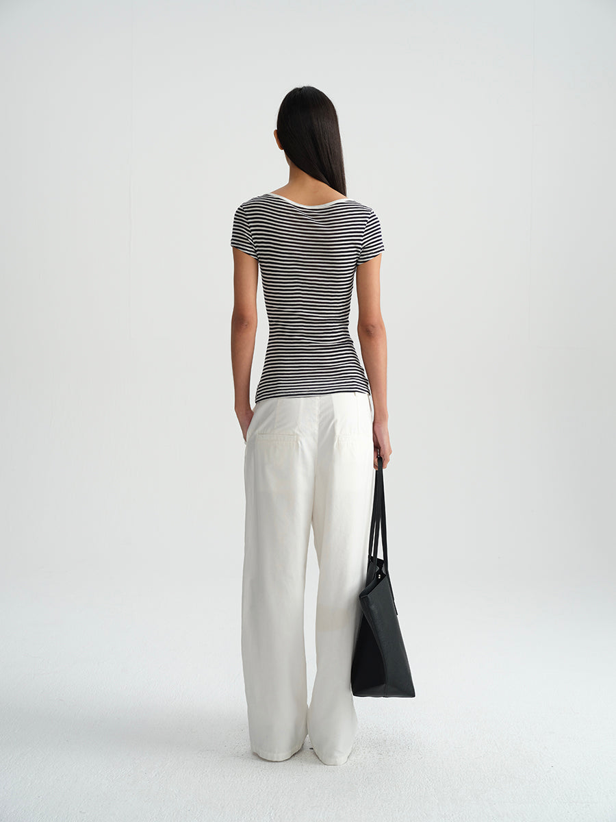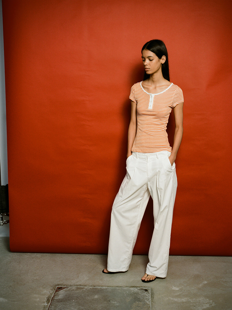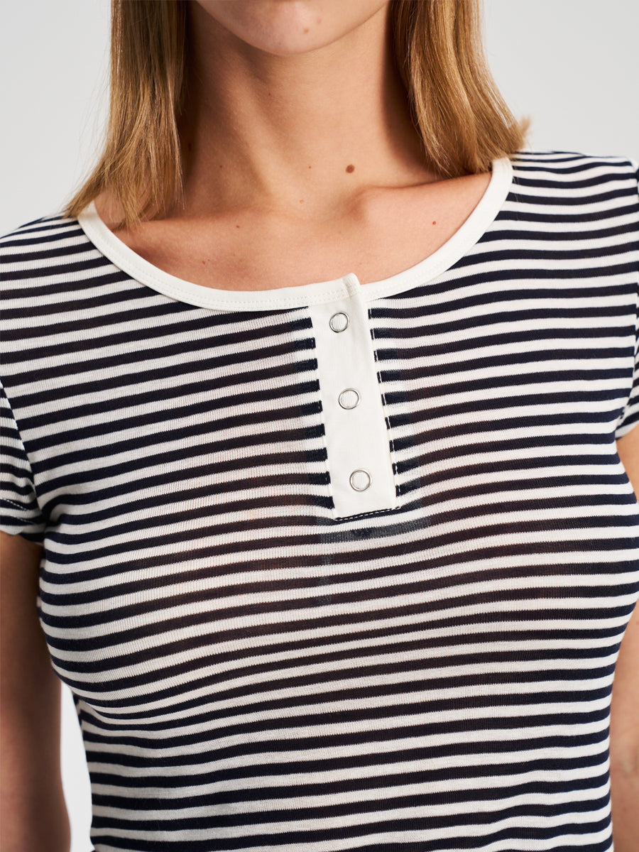 Hughum Orange navy blue sky silk knit crewneck waist T-shirt